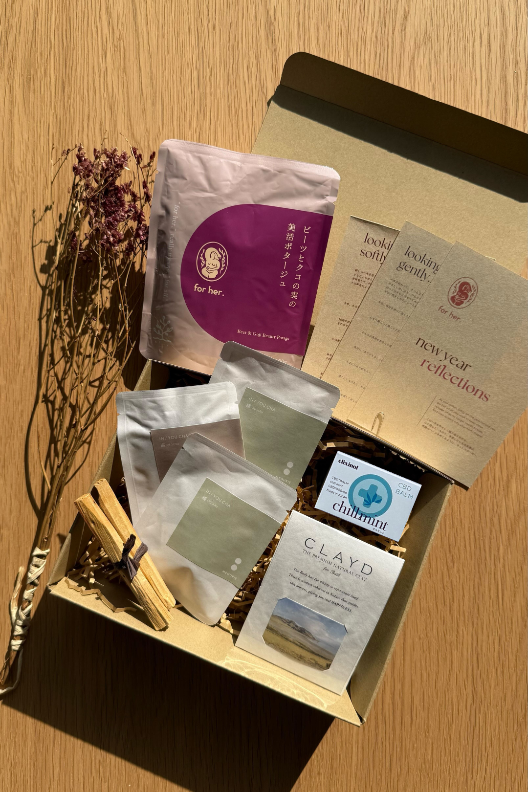 for her.のおすすめ商品を詰め合わせたretreat boxです。1日ゆっくりお過ごしいただくための「one day retreat box」と半日だけでも自分時間に使っていただける「half day retreat box」の2種をご用意。